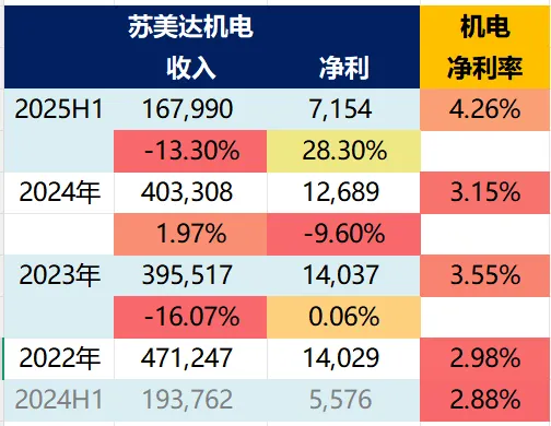 由上表可以看出苏美达机电收入增长不明显,2022年收入47.12亿,2023年收入39.55亿下滑了16%,2024年收入40.33亿增长2%,2025H1收入16.8亿下滑了13.3%。而净利润2022年1.4亿,2023年1.4亿,2024年1.27亿,2025年上半年净利润7154万增长28.30%。