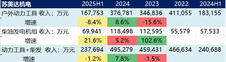 可以看出柴发在2023年收入增长了一倍达到了11亿,2025年上半年增长21.6%。收入里面大头是户外动力工具是35-40亿。