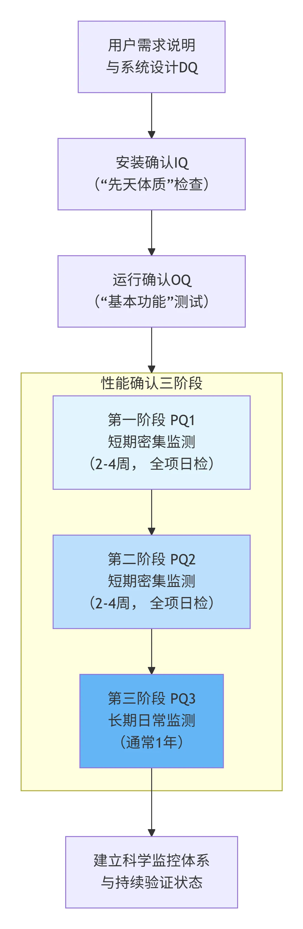 2. 确认生命周期与三阶段PQ的核心逻辑纯化水系统的确认以其独特的 “三阶段性能确认” 为核心,这是区别于其他系统的关键。