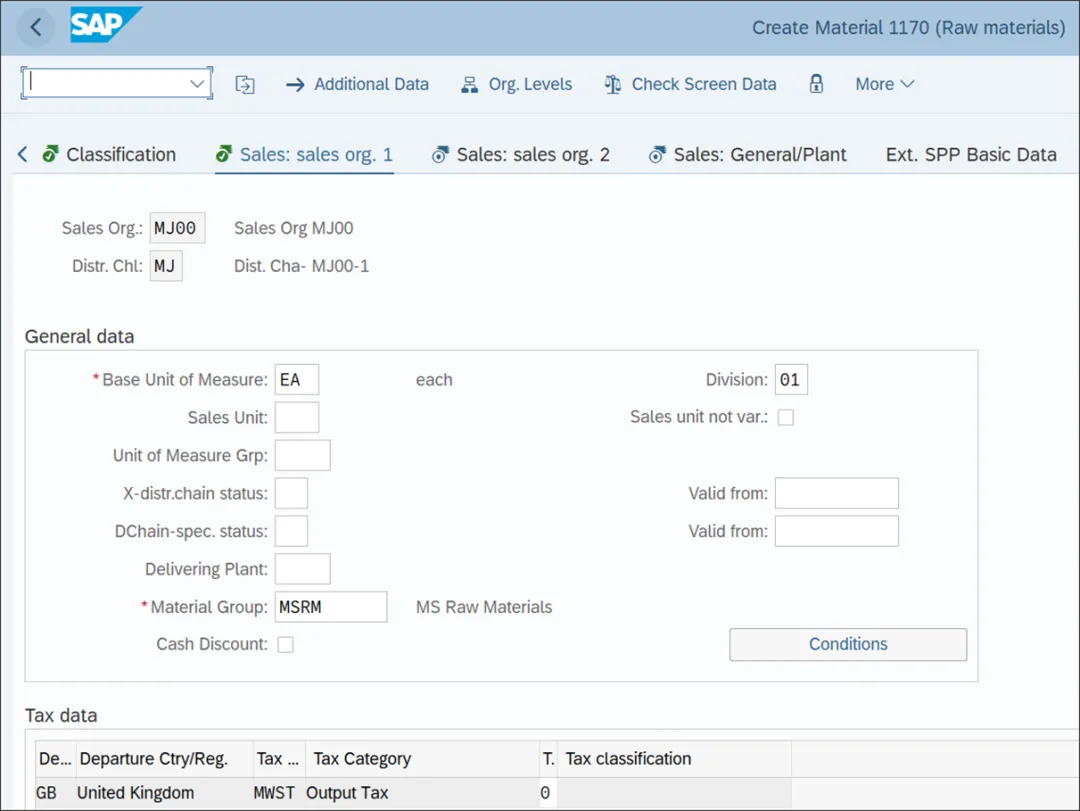 物料的销售视图维护在销售组织、分销渠道和工厂级别。您可以为一个或多个销售组织和分销渠道组合以及工厂定义物料的销售视图。创建销售文档和库存转储订单时,物料的销售视图是必需的,因此为贸易商品、某些原材料、成品、半成品等创建销售视图至关重要。物料主数据有三种销售视图:下图显示了物料主数据的“销售:销售组织 1”视图。基本计量单位、物料组和部门会自动从物料主数据的“基本数据 1”视图复制过来。不过,您可以在该视图中更改部门。以下是物料主数据“销售:销售组织 1”视图的重要字段:指定物料销售时使用的计量单位。此计量单位用于销售文档(如销售订单)中向客户销售物料。如果销售单位与基本计量单位相同,则无需在此字段中指定销售单位。如果您设置此标识并为物料指定了销售单位,则销售订单必须仅使用该销售单位创建。如果您创建了一个包含多个替代计量单位的计量单位组用于销售物料,请指定适用于该物料的计量单位组,以便创建销售文档(销售订单)。SAP S/4HANA 中的分销渠道是销售组织和分销渠道的组合。在此字段中,指定适用于所有分销渠道的物料状态,这是一个全局设置。如果物料处于激活状态,请输入 X - 分销渠道状态的有效起始日期。下表显示了可为物料设置的分销渠道状态。分销渠道状态 描述1 无替代产品停产2 有替代产品停产3 技术缺陷4 测试部件在此字段中,指定适用于特定分销渠道的物料状态。如果物料处于激活状态,请输入分销渠道状态的有效起始日期。上表显示了可为物料设置的分销渠道状态。指定一个工厂,该工厂根据外向交货向客户发放物料库存。这允许在一个工厂创建销售订单,而向客户发货的工厂是同一法律实体(公司代码)内的另一个工厂。在税务数据下,指定出发国家(发货地)、税务条件类型和税务分类(税务标识),以确定销售文档中的销项税代码。你若喜欢,点个❤️谢先👇