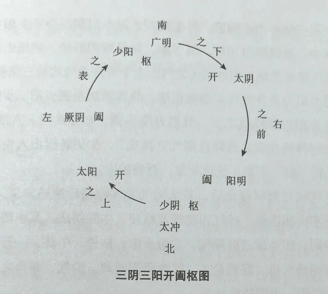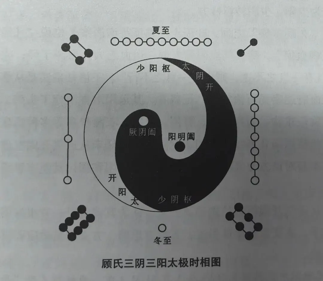 说到阴阳,顾植山老师认为自然界的阴阳不是静态的比对,太极阴阳是一种具有盛衰变化周期的节律运动,由此演化出三阴三阳。《素问·至真要大论》黄帝曰:“愿闻阴阳之三何谓?岐伯曰:气有多少异用也。”就是说:阴阳虽然能代表事物的两个方面,但是同一事物的不同阶段,其阴或阳总是有偏多偏少的不同,因此它的作用也就各不相同,所以又分三阴三阳。《素问·天元纪大论》鬼臾区曰:“阴阳之气各有多少,故曰三阴三阳也。形有盛衰,谓五行之治,各有太过不及也。”顾植山老师认为,古人将自然界阴阳气的盛衰变化理解为一种周期性的离合运动,一开一阖,一阴一阳,是一个离合运动,又叫做开阖、捭阖。《素问·阴阳离合论》云:“圣人南面而立,前曰广明,后曰太冲;太冲之地,名曰少阴;少阴之上,名曰太阳;······广明之下,名曰太阴;太阴之前,名曰阳明;······厥阴之表,名曰少阳。是故三阳之离合也,太阳为开,阳明为阖,少阳为枢;······三阴之离合也,太阴为开,厥阴为阖,少阴为枢。”见下图。老师临证善于运用运气学说“开阖枢”理论阐述病机,认为自然界及人体之阴阳气化运动,终不离“开阖枢”。三阳之开、阖、枢,为什么太阳为开,少阳为枢,阳明为阖?从图1-3中可以看到,太阳在东北方,冬至过后,正是阳气渐开之时,故为阳之“开”;阳明在西北方,阳气渐收,藏合于阴,故为阳之“阖”;少阳在东南方,夏至太阳回归,阴阳转枢于此,故为阳之“枢”。三阴之开、阖、枢同理:太阴在西南,夏至以后,阴气渐长,故为阴之“开”;厥阴居东向南,阴气渐消,并合于阳,故为阴之“阖”;少阴在正北方,冬至阴极而一阳生,故为阴之“枢”。顾植山教授认为三阴三阳是阴阳学说的精髓,阴阳之气升降出入是六经的灵魂。《伤寒论》以三阴三阳为纲统领临床辨证,契合《内经》动态的天人相应思想。顾植山教授描述三阴三阳开阖枢图见下图。二、从三阴三阳开阖枢临床论治失眠