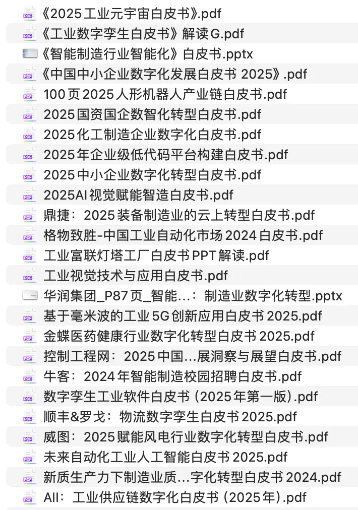 礼包涵盖人工智能、数字化转型、数字孪生、工业软件等核心赛道的深度资料,既有前沿技术的拆解,也有标杆案例的复盘。希望这份沉甸甸的“数字弹药库”,能为你在新一年的项目规划、技术选型与工厂升级中,提供最坚实的决策参考。