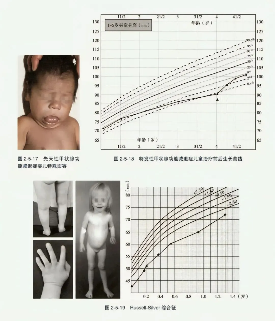 - 先天性甲状腺功能减退症:为甲状腺分泌甲状腺激素不足所致,发病率约为1/2050。严重先天性甲减儿童生长缓慢,为身材比例不匀称矮小(坐高/身高比例幼稚),骨龄显著延迟,黏液性水肿面容(眼距宽、鼻梁宽平、舌大而宽、表情淡漠),皮肤粗糙,智力低下。因甲状腺素(T₄)能从胎盘转运供给患儿,婴儿出生时症状可不典型,如仅表现纳少、黄疸、便秘等,易被忽略。