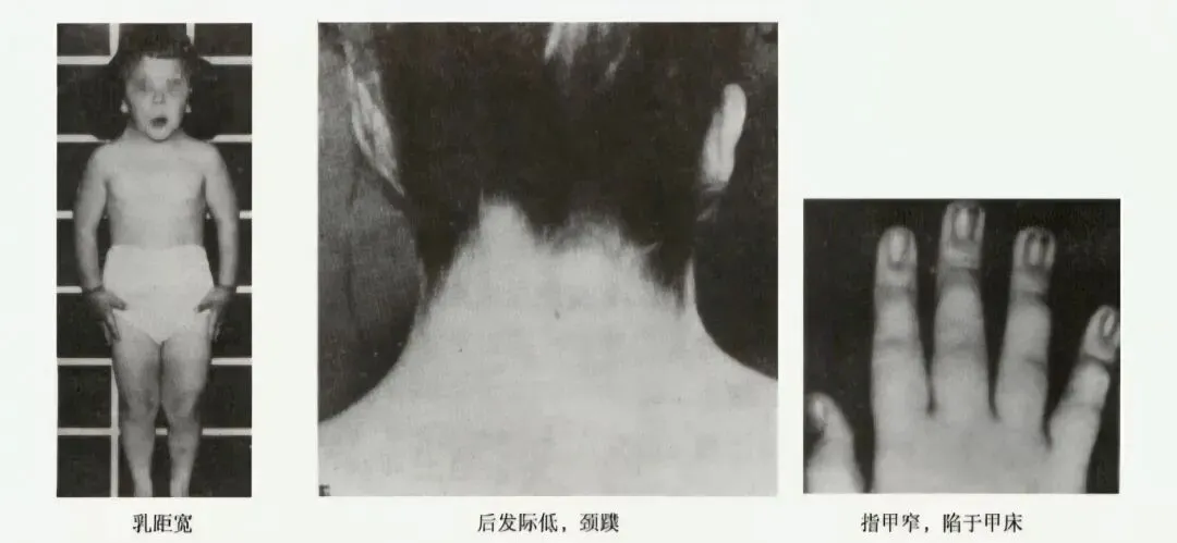 - Turner综合征(TS):又称先天性卵巢发育不全,所有(45,XO)或部分细胞(45,XO/46,XX)缺少一条或部分X染色体,是人类唯一能生存的单体综合征,也是女童矮小最常见的病因之一,发生率为1/5000~1/2000。特征性体征为身材矮小,性发育呈幼稚状态及原发性闭经;颈蹼、肘外翻、发际低、盾状胸、乳头间距增宽、无第二性征;智力多正常。