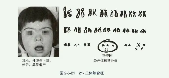 - 21-三体综合征:又称先天愚型,有共同的特殊面容(眼距宽,小眼裂,双眼外上斜,鼻梁低平,伸舌),生长迟缓,智力发育障碍等多发畸形。