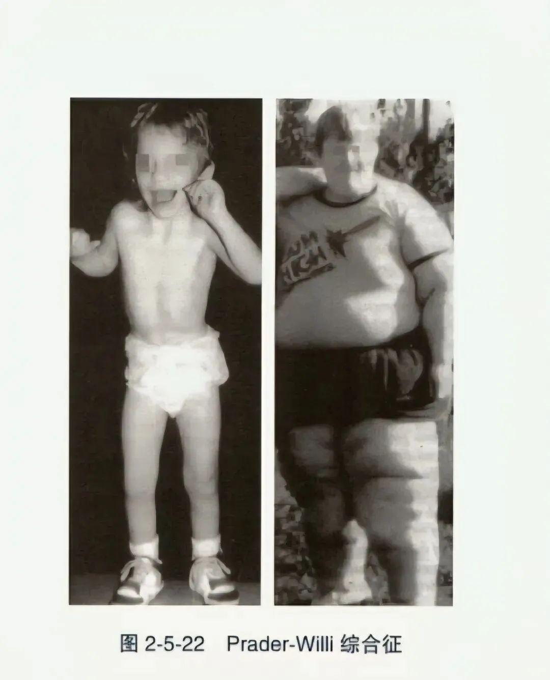 - Prader-Willi综合征(PWS):又称隐睾-侏儒-肥胖-智力低下综合征,发病率为1/25000~1/10000,已证实为母源15号染色体的单亲二体或父源15号染色体上的关键片段发生微小缺失所致。症状与年龄有关,婴幼儿期严重肌无力致喂养困难,1~4岁因食欲亢进而出现中枢性肥胖。特殊面容如狭额、小眼裂、鱼形嘴、小下颌;身材矮小,骨龄正常或延迟,外生殖器发育不良如小阴茎、隐睾、缺乏第二性征。