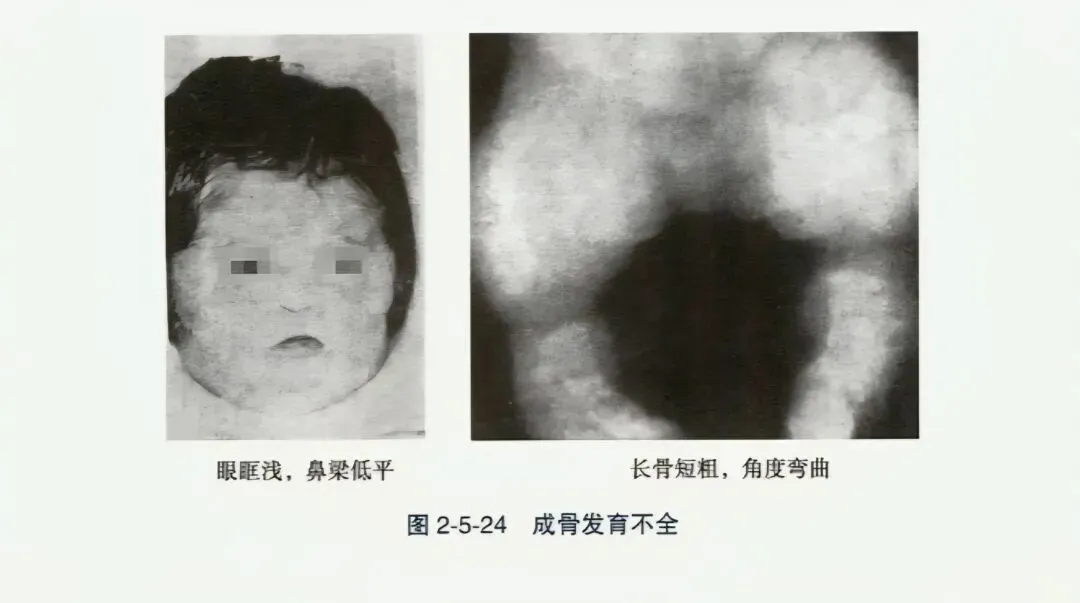 - 成骨不全症(OI):以反复多发性骨折和骨骼畸形为特点,分先天型(重型)和迟发型(轻型)。先天型儿童的骨折始于胎儿或新生儿期,生长迟缓,肢体粗短,伴多种骨骼畸形,常因颅内出血致宫内死亡或早年夭折,骨骼X线多为粗骨型。迟发型成骨不全为婴儿期后一年后出现骨折和骨骼畸形,如脊椎侧弯、后突与胸廓畸形,因脊柱及下肢多发性骨折畸形造成生长迟缓;可伴蓝色巩膜,传导性或神经性耳聋。骨骼X线显示多处陈旧性骨折,细骨型。