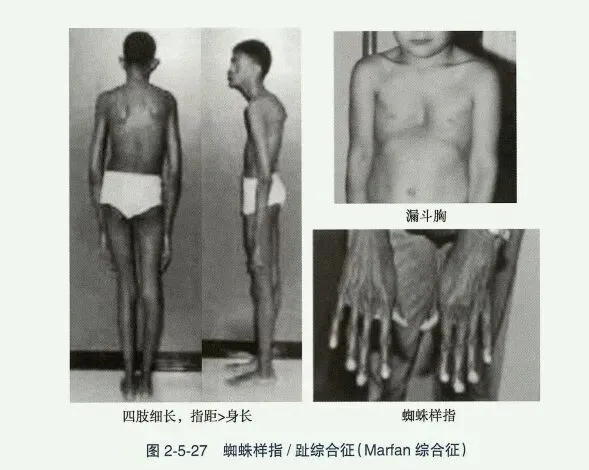 - 马方综合征(Marfan syndrome, MS):又称蜘蛛样指/趾综合征,系常染色体显性遗传性结缔组织疾病,与原纤维蛋白基因(fibrillin-1, FBN1)异常有关。MS是以管状骨细长、蜘蛛样指/趾、眼晶状体移位及先天性心脏病为特征的一组综合征。肢体细长,手和膝过度伸展,智力正常。