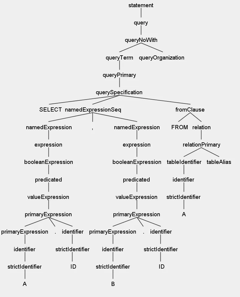 生成语法树一般过程:字符流->词法解析器->token流->语法解析器->语法树。对于字符流经过词法解析器后变成token流,如 SELECT A.ID,B.ID FROM A 将变成如下的token流。