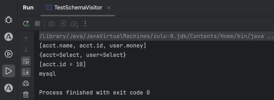 package com.changlu.visitor;import com.alibaba.druid.sql.ast.SQLStatement;import com.alibaba.druid.sql.dialect.mysql.parser.MySqlStatementParser;import com.alibaba.druid.sql.dialect.mysql.visitor.MySqlSchemaStatVisitor;import com.alibaba.druid.sql.parser.SQLStatementParser;/** * 验证MySqlSchemaStatVisitor */public class TestSchemaVisitor { public static void main(String[] args) { SQLStatementParser parser = new MySqlStatementParser("select name ,id ,select money from user from acct where id =10"); SQLStatement sqlStatement = parser.parseStatement(); // 定义visitor MySqlSchemaStatVisitor visitor = new MySqlSchemaStatVisitor(); // 执行visitor访问操作 sqlStatement.accept(visitor); // 获取到最终的字段名、tables、条件分支、db类型 System.out.println(visitor.getColumns()); //[acct.name, acct.id, user.money] System.out.println(visitor.getTables()); //{acct=Select, user=Select} System.out.println(visitor.getConditions()); //[acct.id = 10] System.out.println(visitor.getDbType());//mysql }}