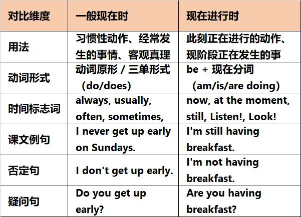 一般现在时与现在进行时的对比(习惯 vs. 此刻正在发生)