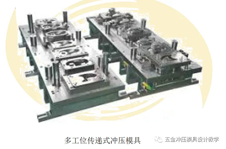 (5)多工位精密自动级进模主要用于小型复杂冲压件的大批量生产,对较大的制件可选择如图所示的多工位传递式冲压模具加工。