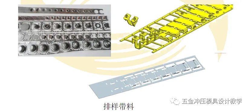 排样是多工位精密自动级进模设计的关键。排样图的优化与否,不仅关系到材料的利用率、制件的精度、模具制造的难易程度和使用寿命等,而且直接关系到模具各工位加工的协调与稳定。如图所示为多工位精密自动级进模冲压产品的排样带料示例。