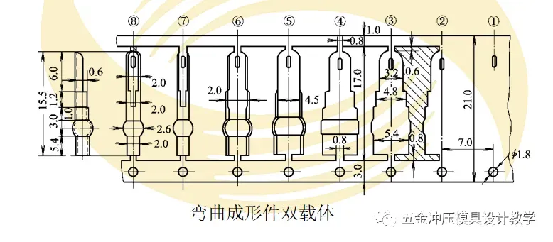 下图所示零件要进行两侧以相反方向卷曲的成形弯曲,选用单中载体难以保证成形件成形后的精度要求,选用可延伸连接的双中载体可保证成形件的质量。当然,载体宽度较大,材料利用率降低是其缺点。