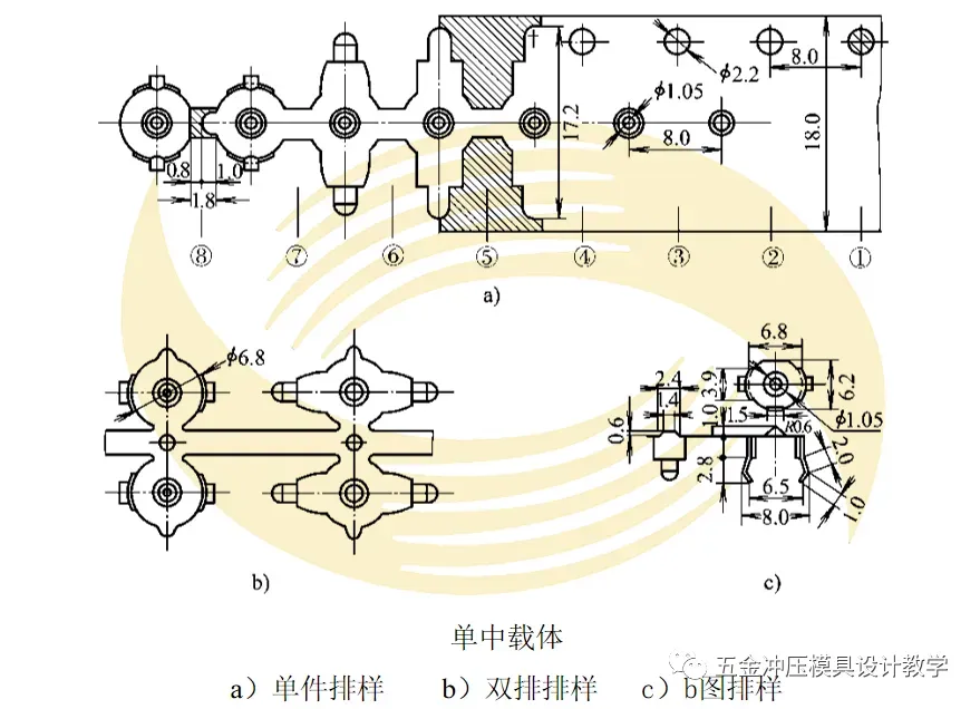 中载体在成形过程中平衡性较好。如上图所示是同一个零件选择中载体时不同的排样方法。图a是单件排列,图b是可提高生产效率一倍的双排排样。