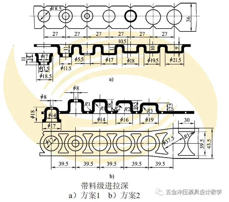 进行多工位级进拉深成形时,不像单工序拉深模那样以散件形式单个送进, 而是通过带料以组件形式连续送进。通过载体、搭边和坯件连在一起的组件,便于稳定作业,成形效果良好。