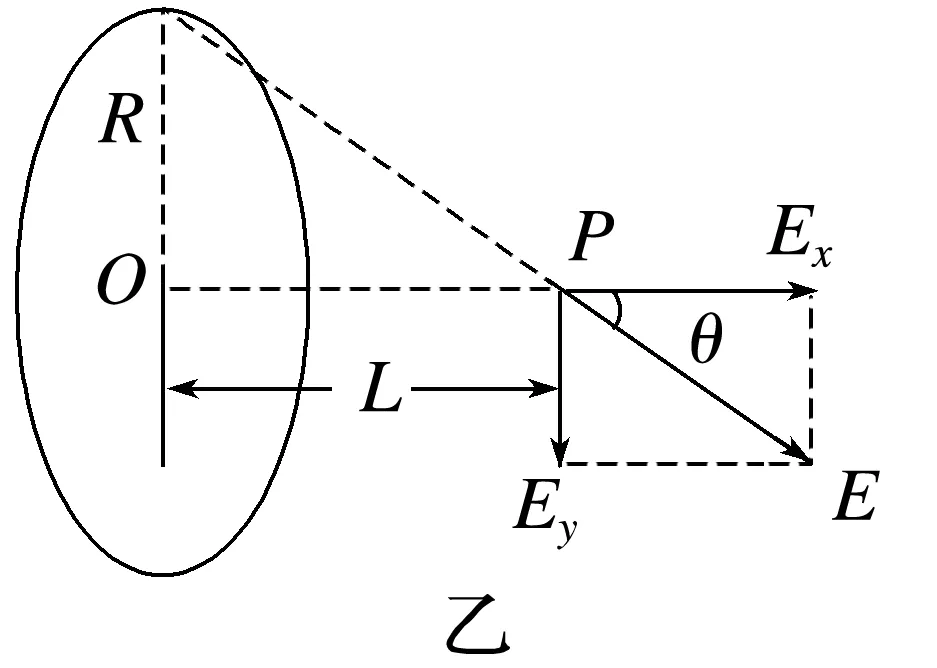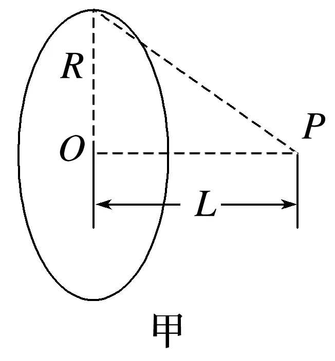 如图甲所示,均匀带电圆环所带电荷量为Q,半径为R,圆心为O,P为垂直于圆环平面中心轴上的一点,OP=L,静电力常量为k,求P点的电场强度大小时: