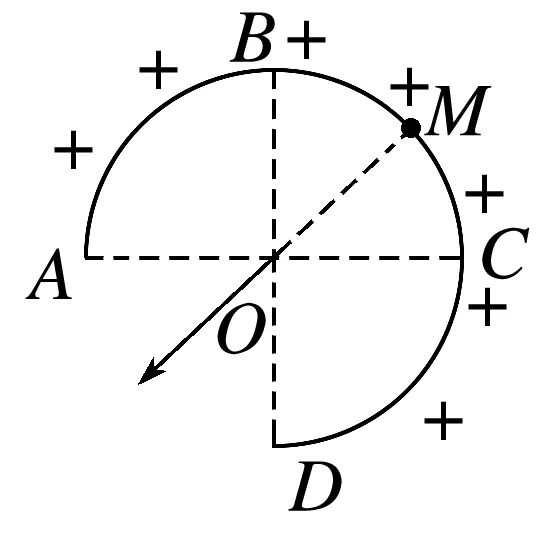 例如:均匀带电的圆环有一个14圆弧的缺口,判断O点的电场强度方向时,由于圆环上任何两个关于圆心中心对称的两点在O点产生的电场强度矢量和为零,故可以等效为弧BC在O点产生的电场强度,弧BC上关于OM对称的两点在O点产生的电场强度沿MO方向,故 O点的电场强度沿MO方向。