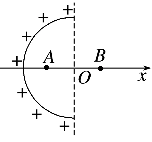 例如:已知均匀带电球壳内部电场强度处处为零。如图半球球壳电荷量为+q,A、B两点关于半球壳球心O点对称,且半球壳在A点产生的电场强度大小为E。求半球壳在B点产生的电场强度大小时,可以将题目中半球壳补成一个均匀带电的完整球壳,设右半球在A点产生的电场强度大小为E′。由于均匀带电球壳内部电场强度处处为零,则E′和E大小相等。根据对称性可知,左半球在B点产生的电场强度大小也为E。