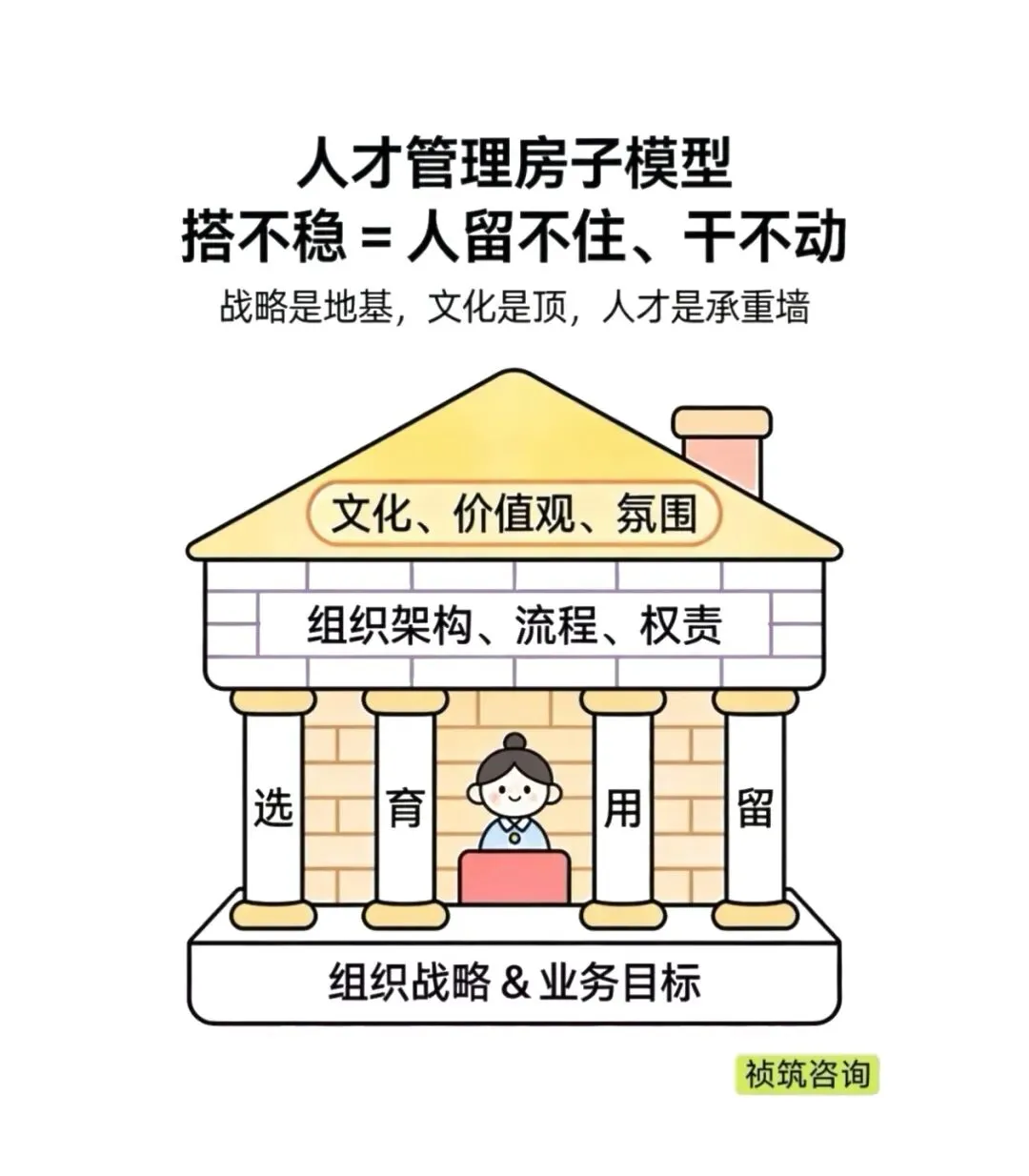 祯筑咨询人才管理房子模型显示,人才管理像盖房:战略目标是地基,选育用留是承重柱,流程权责是墙体,而文化价值观是屋顶。很多企业屋顶很漂亮,柱子却歪了,导致人才如流沙般逝去。在“一聚一生”,我们坚信,留住人才的根基,不在于花哨的团建或空洞的口号,而在于能否回答三个问题:他能不能赚到钱?他能不能获得成长?他能不能干得开心?