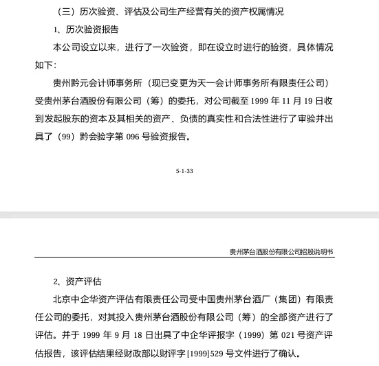 原文:北京中企华资产评估有限责任公司受中国贵州茅台酒厂(集团)有限公司的委托,对其投入贵州酒股份有限公司(筹)的全部资产进行了评估。并于1999年9月18日出具了中企华评报字(1999)第021号资产评估报告,该评估结果经财政部以财评字(1999)529号文件进行了确认。