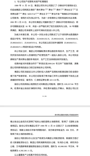 原文:集团公司在发起设立本公司时投入的房产及其相关配套设备已经全部办理资产转移手续,本公司已经取得了贵州省仁怀市土地管理局下发的上述房屋的所有权证,编号为:仁房权证茅台第422-516号;股份公司的用地以租赁方式向集团公司租用,面积为220227.84平方米。经贵州省土地估价事务所评估,并经贵州省是国土厅确认,集团公司以缴纳土地出让金的方式获得了相关土地的国有土地使用权,取得了《国有土地使用证》。股份公司与集团公司于1999年11月19日签订了《土地使用权租赁协议》,根据土地估价并参考周围地价,双方商定年租金为206万元,并取得了该土地的他项权证。股份公司的部分办公及生产用房为向集团公司租赁使用,根据双方签订的《房屋租赁协议》,集团公司将其拥有的办公楼、车间办公室、研究所办公室、万吨酒库等房屋租赁给股份公司使用,面积为83990.005平方米,年租赁费为4392391.11元。