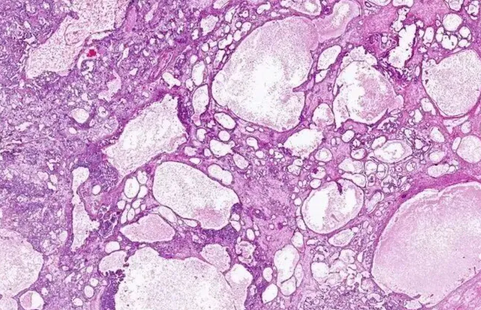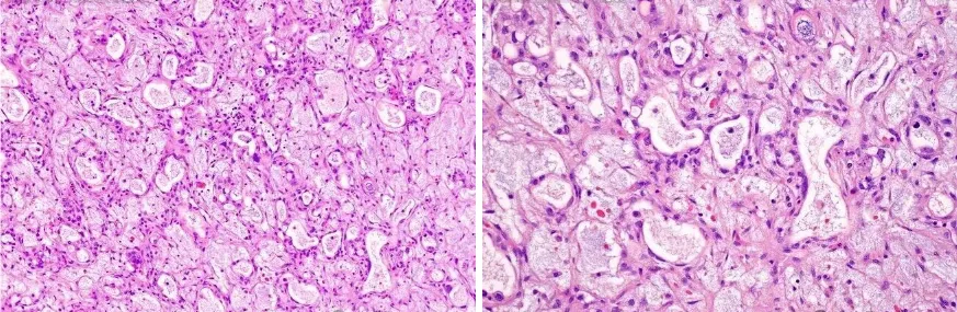 图5:黏液瘤样型,腺样结构和间质内有大量黏液样物质(图片来源于网络)