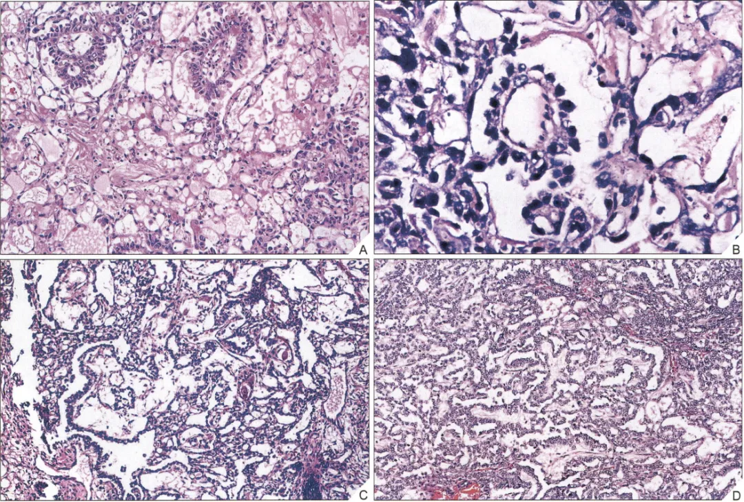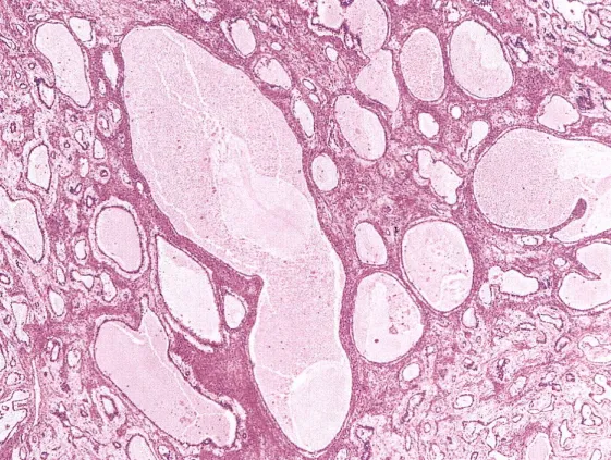 图7:多囊泡型,肿瘤具有大小不等的囊腔或囊泡(图片来源于参考文献1)
