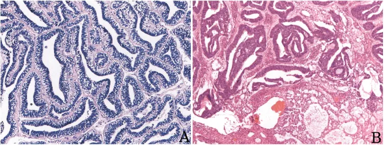 图6:腺样/腺管型,A,腺体呈分泌早期子宫内膜样改变,可见核下空泡;B,肿瘤由微囊型和腺样型混合组成(图片来源于参考文献1)。