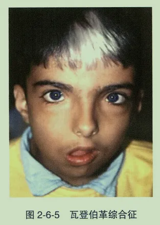 - 瓦登伯革综合征(耳聋白发眼病综合征):常染色体显性遗传。眼部表现为虹膜异色、内眦外移(眼距宽),全身伴额前白发、听力障碍、鼻根宽阔、并眉。由PAX3、MITF、EDNRB及SOX10等基因突变致病。