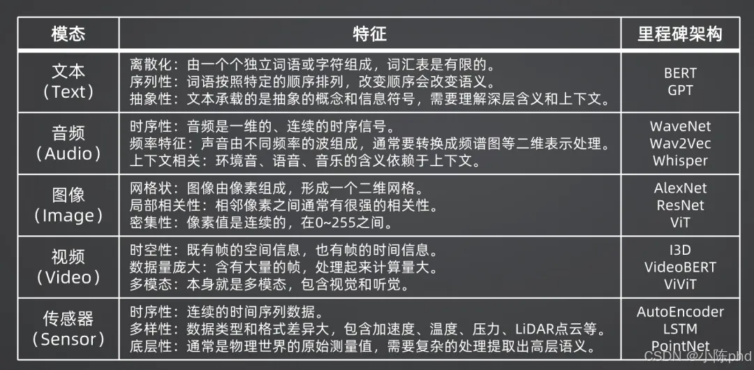- • 多模态:本身就是多模态,包含视觉(图像帧)和听觉(音频),通常还带有文本字幕。