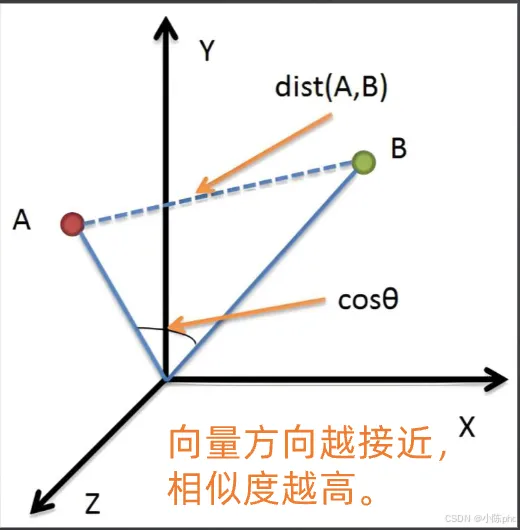 定义:衡量两个特征向量在语义空间中方向一致性的指标,是跨模态对齐的核心相似度度量方式。它只关心向量的方向,而不关心其长度(即数值大小)。