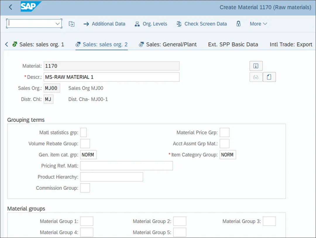 通用项目类别组(一般项目类别组)的值会自动从物料主数据的“基本数据 1”视图复制过来。以下是物料主数据“销售:销售组织 2”视图的重要字段:在此指定一个物料统计组。系统使用此数据更新销售文档信息以生成统计数据。在此指定一个物料价格组。系统使用此数据为销售文档中的价格确定应用相同的定价条件。您可以使用物料价格组为一组物料创建相同的定价条件记录。在此字段中为物料指定一个科目分配组,以便在创建销售开票文档时确定会计文档中的收入科目。为物料指定一个项目类别。项目类别组在根据销售订单或库存转储订单创建的外向交货的项目类别确定中起着至关重要的作用。例如,NORM 是标准项目的项目类别组。物料的不同特性/特征按层次结构级别进行分组。您可以通过不同方式对特性进行分组,例如按电气特性、机械特性、颜色、型号、品牌等。您可以定义最多 18 位的产品层次结构代码。例如,一个电动水泵的产品层次结构可以描述为 000010000200000015,其中前五位(00001)表示该产品属于电气商品类别,第 6 到 10 位(00002)表示该产品属于机械商品类别,第 11 到 18 位(00000015)表示该产品属于水泵类别。按照配置设置中定义的内容指定物料的产品层次结构。要定义产品层次结构,请执行事务代码 SPRO 并导航至后勤 - 通用 • 物料主数据 • 关键字段设置 • 与销售和分销相关的数据 • 定义产品层次结构。“销售:销售组织 2”视图中有五个物料组字段。这些字段仅用于销售和分销中的定价确定以及报表编制。根据业务需求在这些字段中分配物料组。