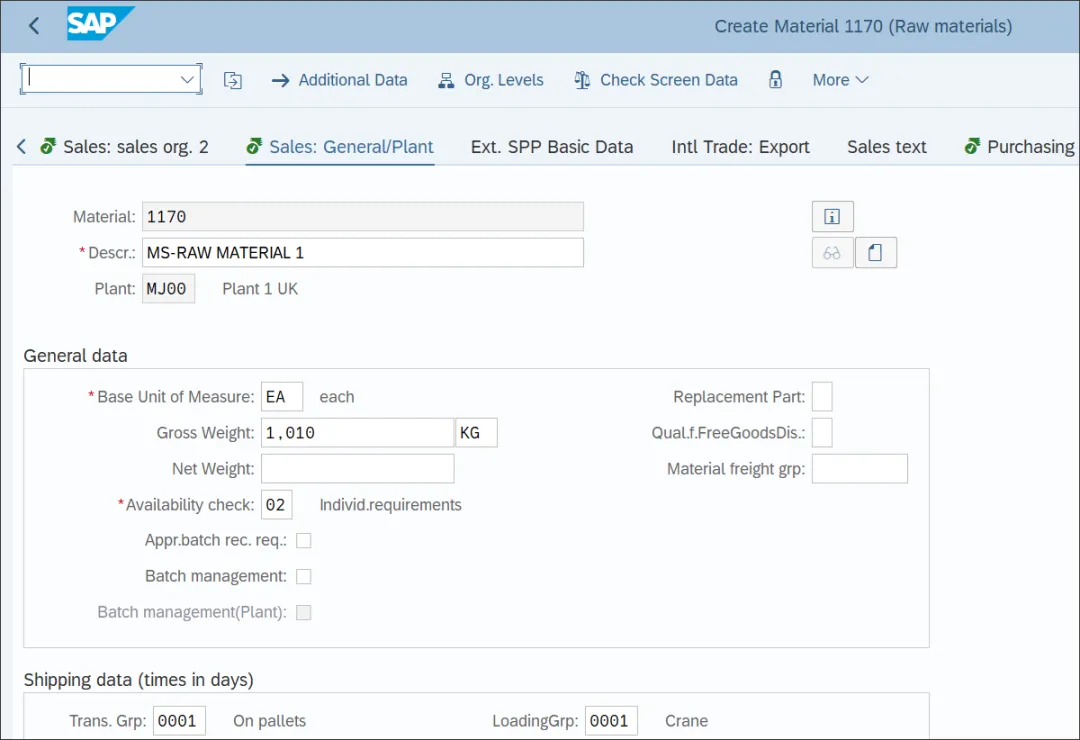 基本计量单位、毛重和净重会自动从物料主数据的“基本数据 1”视图复制过来。以下是物料主数据“销售:通用/工厂”视图的重要字段:指定该物料是否可以作为替换部件。此物料标识用于销售开票文档。可用性检查组在提供有关库存可用性的准确信息以满足客户订单方面起着至关重要的作用。它们用于在 SAP S/4HANA 中配置可用性检查。在此为物料指定可用性检查组。如果您激活批次管理,物料在库存管理中进行外向交货时将按批次进行管理和发放。在此为物料指定一个运输组,用于在销售订单和交货处理过程中进行运输路线安排。为物料指定一个装载组,以便在销售订单和交货处理过程中自动确定发货点。你若喜欢,点个❤️谢先👇