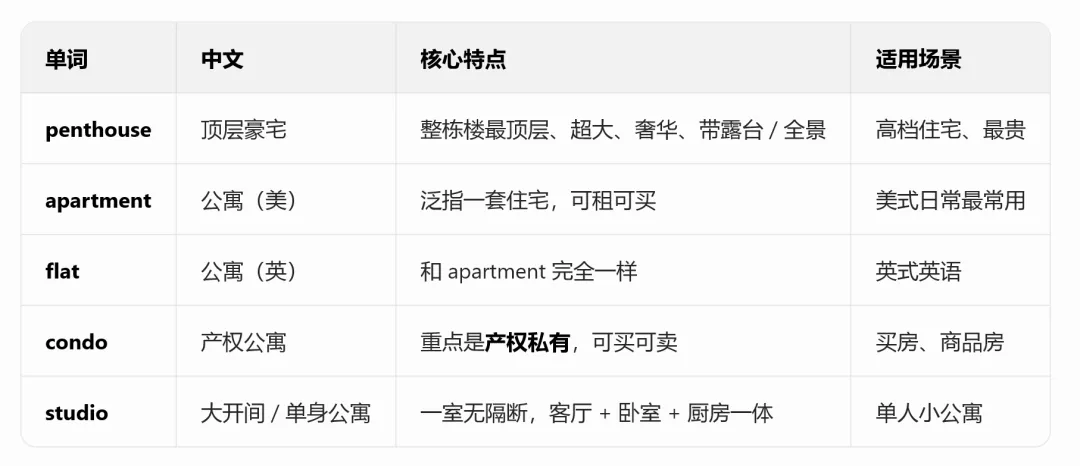 一句话速记:studio 最小,penthouse 最贵,apartment/flat 最普通,condo 看产权。