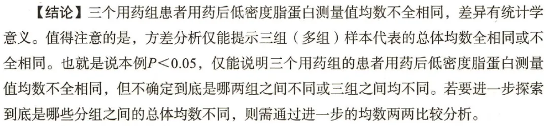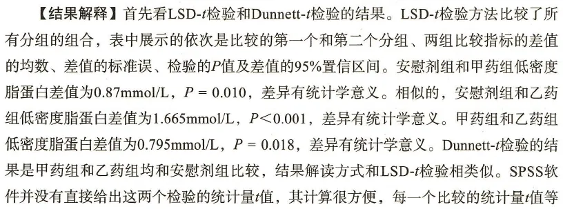 ANOVA 只告诉你:至少有两组不一样但没告诉你谁和谁不一样 所以必须加:SNK、LSD、Bonferroni、Dunnett 等事后检验 临床论文标准写法: