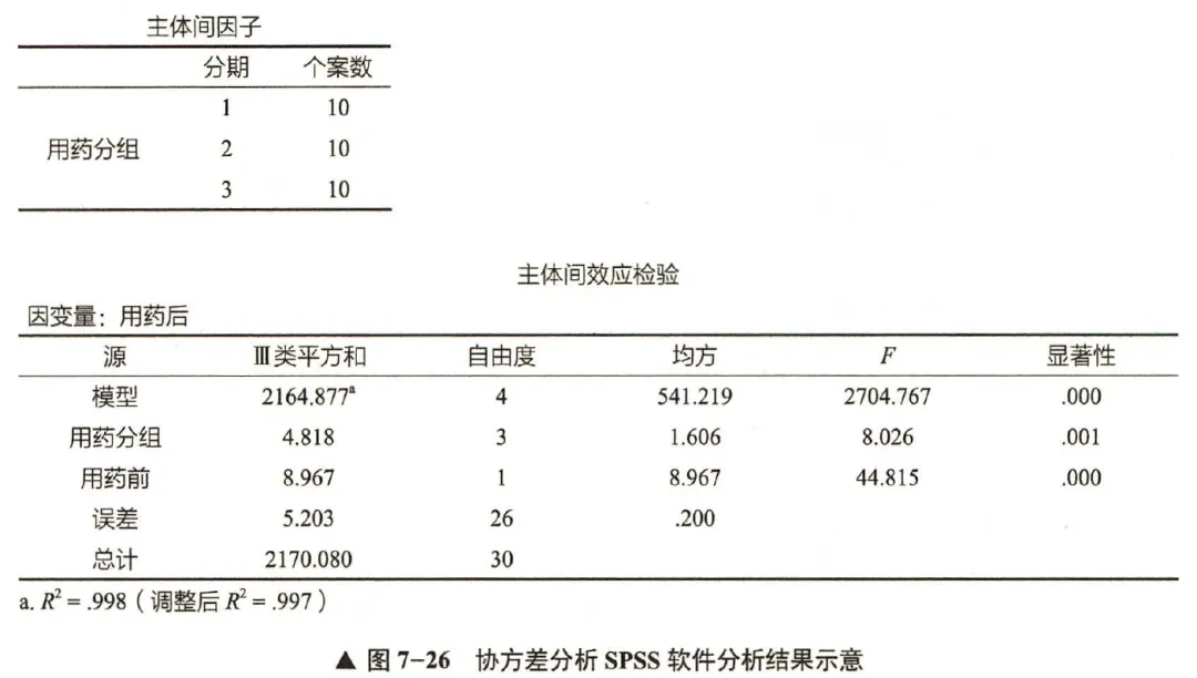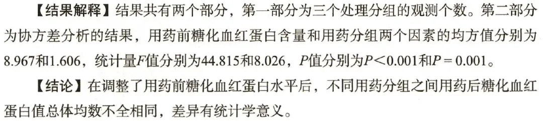【问题分析】由于患者用药前的糖化血红蛋白水平会影响后用药后的含量,因此本研究可采用协方差分析,将用药前的糖化血红蛋白值作为协方差,用药后的糖化血红蛋白值作为因变量,用药分组作为分组变量。