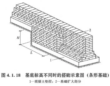 (1)基底标高不同时,应从低处砌起,并应由高处向低处搭砌。当设计无要求时,搭接长度L不应小于基础底的高差H,搭接长度范围内下层基础应扩大砌筑。
