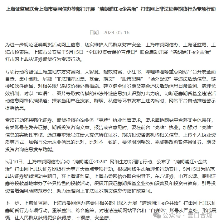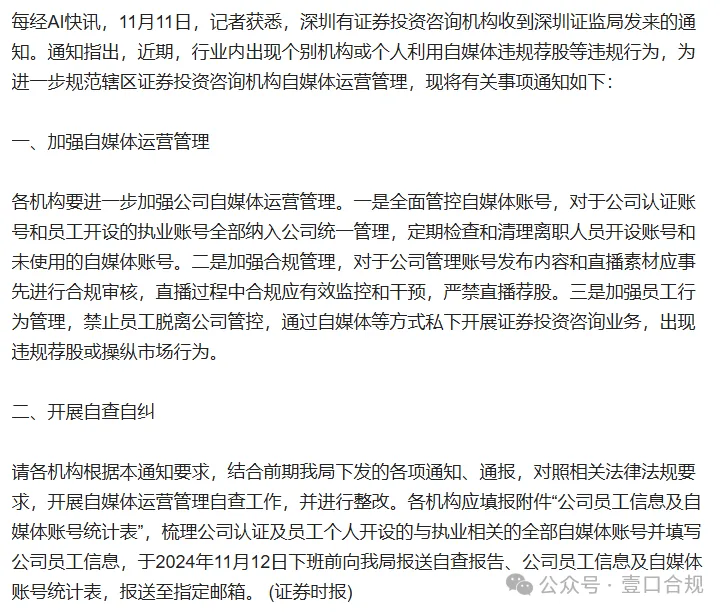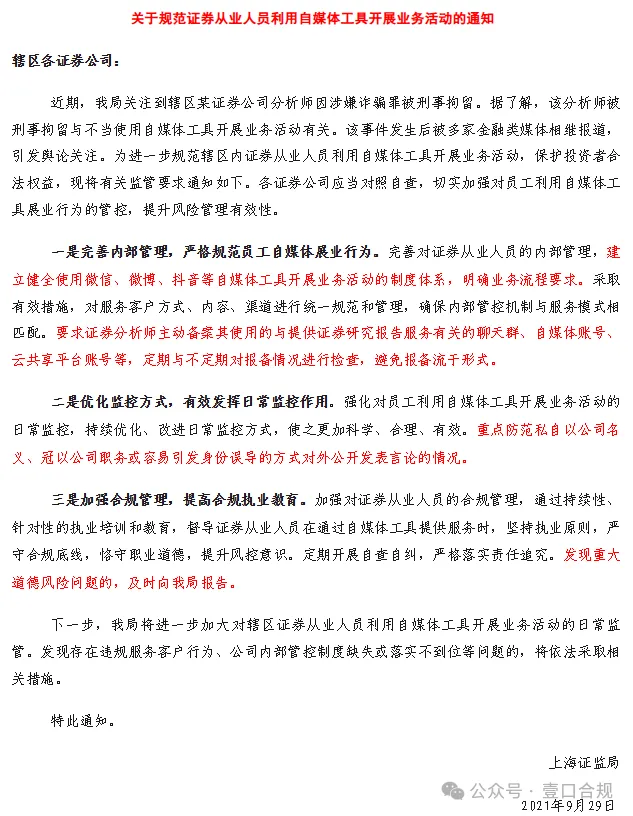 近期不少小伙伴咨询有关自媒体管控的外规要求,在此做个梳理,供大家参考。目前来看,并未有一个专门的法规对自媒体展业进行统一规范,能够找到只有三份面向辖区机构发布的监管通知,即:2021年9月29日上海证监局发布《关于规范证券从业人员利用自媒体工具开展业务活动的通知》;2024年5月16日上海证监局官方网站发布通知《上海证监局联合上海市委网信办等部门开展“清朗浦江·e企共治”打击网上非法证券期货行为专项行动》;2024年11月深圳证监局发布的《进一步规范深圳证券投资咨询机构自媒体运营管理通知》。三份通知的原文附后。梳理三份通知,其中关于自媒体展业的要求主要包括以下七个方面:1、制定自媒体展业规范与要求。完善对证券从业人员的内部管理,建立健全使用微信、微博、抖音等自媒体工具开展业务活动的制度体系,明确业务流程要求。采取有效措施,对服务客户方式、内容、渠道进行统一规范和管理,确保内部管控机制与服务模式相匹配。2、自媒体全部纳入公司管理。对于公司认证账号和员工开设的执业账号全部纳入公司统一管理,要求员工主动备案其使用的与提供服务有关的聊天群、自媒体账号、云共享平台账号等,定期与不定期对报备情况进行检查,避免报备流于形式。定期检查和清理离职人员开设账号和未使用的自媒体账号。3、落实“亮牌”执业的要求。有关账号在发表证券、期货投资咨询文章、报告或者意见时,要在前台“亮牌”执业。对“亮牌”信息进行实质性审核,与公示从业信息进行比对,比对不一致的,要求限期整改,完成整改前暂停其证券、期货投资咨询信息发布功能。4、做好发布内容和素材管控。对于公司管理账号发布内容和直播素材应事先进行合规审核,直播过程中合规应有效监控和干预,严禁直播荐股。禁止员工脱离公司管控,通过自媒体等方式私下开展证券业务。5、加强日常监控防范违规。强化对员工利用自媒体工具开展业务活动的日常监控,持续优化、改进日常监控方式,使之更加科学、合理、有效。重点防范私自以公司名义、冠以公司职务或容易引发身份误导的方式对外公开发表言论的情况。6、加强员工教育提升意识。加强对证券从业人员的合规管理,通过持续性、针对性的执业培训和教育,督导证券从业人员在通过自媒体工具提供服务时,坚持执业原则,严守合规底线,恪守职业道德,提升风控意识。7、定期自查自纠及时报告。定期开展自查自纠,严格落实责任追究。发现重大道德风险问题的,及时向我局报告。免责声明:本文系个人整理,如有出入,请咨询专业机构并查询相关法律法规及监管部门意见,本人不承担任何责任。关注公众号可了解更多案例分析和规则解读!获取2020-2025年处罚材料、商务合作、信息共享、入群、投稿、转载可扫码添加作者!知识星球《壹口合规》已正式开通,加入后可获取海量资料: