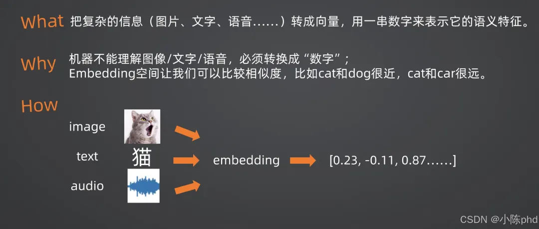 定义:Embedding是将复杂的非结构化信息(如图像、文本、语音)转换为低维稠密向量的过程,用一串数字来表示其语义特征。
