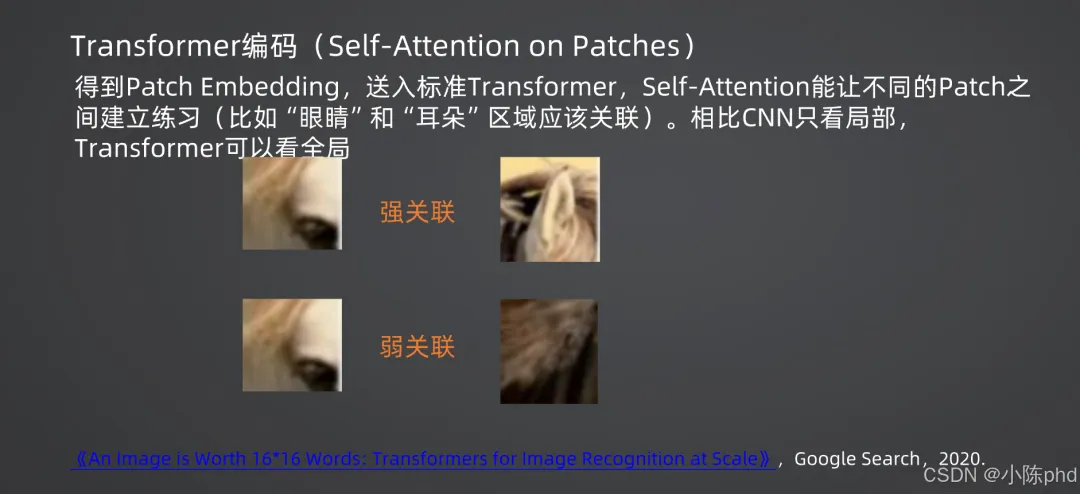 - 3. Transformer编码:将Patch Embedding序列送入标准Transformer,通过自注意力机制让不同Patch之间建立关联(如“眼睛”和“耳朵”的Patch会形成强关联),相比CNN仅关注局部特征,Transformer可捕捉全局语义;