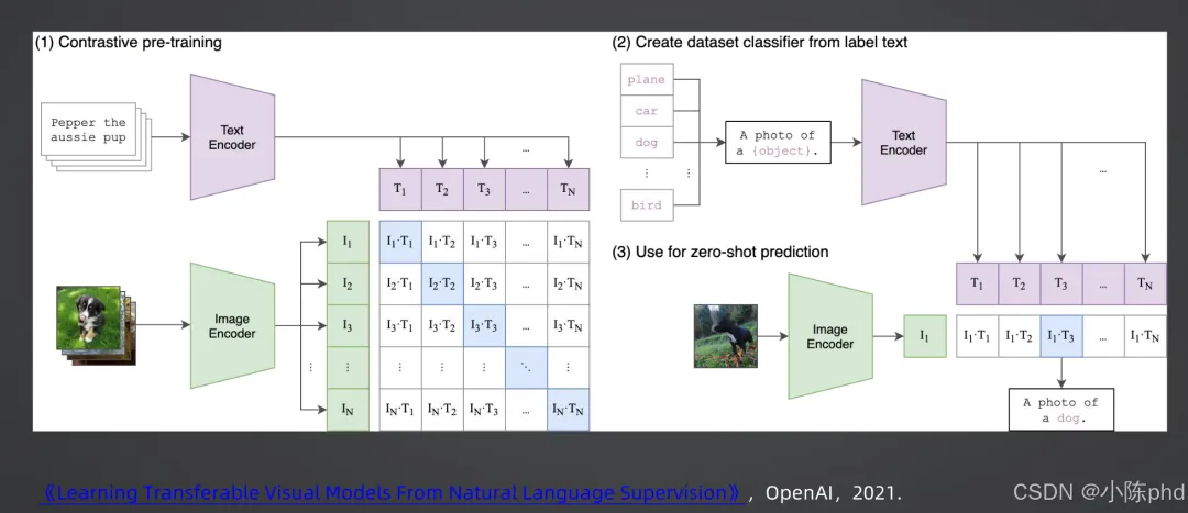 2021年,OpenAI提出CLIP(Contrastive Language-Image Pre-training),彻底推动了双塔架构的大规模应用,核心流程分为三步: