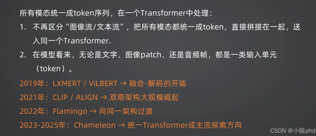 统一Transformer架构是多模态模型的最新演进方向,核心是打破模态边界,用单一Transformer架构处理所有模态,实现“一统多模态”的目标。