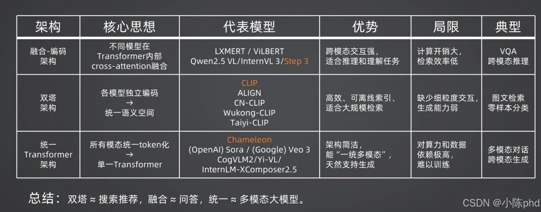 - 1. 融合-编码架构:优先保证模态交互深度,适合需要深度理解的任务,但牺牲了效率;