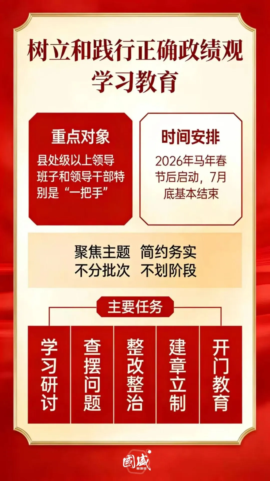 近日,中共中央办公厅印发《关于在全党开展树立和践行正确政绩观学习教育的通知》。《通知》强调,要组织党员、干部深入学习习近平总书记关于树立和践行正确政绩观的重要论述,深入学习《中共中央关于制定国民经济和社会发展第十五个五年规划的建议》,深入学习习近平总书记关于本地区本部门本领域的重要讲话和重要指示精神,进一步强化立党为公、为民造福理念。
