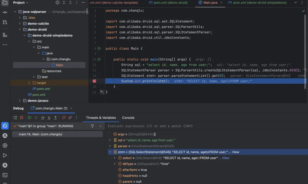 import com.alibaba.druid.sql.ast.SQLStatement;import com.alibaba.druid.sql.parser.SQLParserUtils;import com.alibaba.druid.sql.parser.SQLStatementParser;import com.alibaba.druid.util.JdbcConstants;public class Main { public static void main(String[] args) { String sql = "select id, name, age from user;"; SQLStatementParser parser = SQLParserUtils.createSQLStatementParser(sql, JdbcConstants.HIVE); SQLStatement stmt= parser.parseStatementList().get(0); System.out.println(stmt); }}