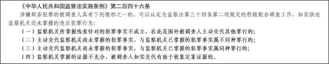 《监察法实施条例》第二百四十六条对《监察法》第三十四条第二项的规定进行了细化,为认定被调查人“积极配合调查工作,如实供述监察机关还未掌握的违法犯罪行为的”提供了规范依据。