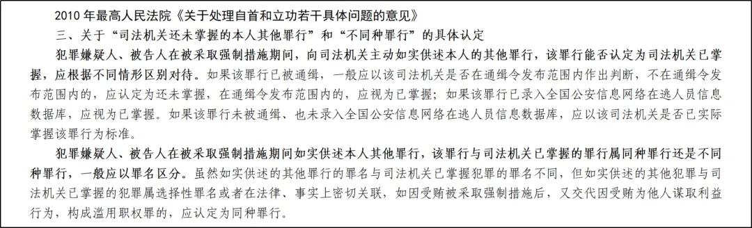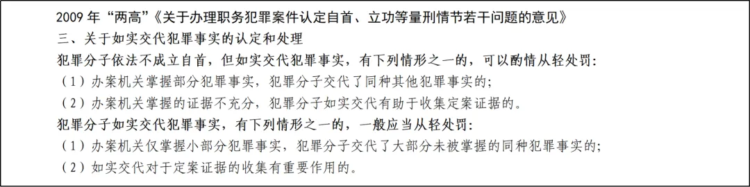 【注意】对于该款第(三)项规定的情形,有观点主张按特殊自首处理,但在2009年“两高”《关于办理职务犯罪案件认定自首、立功等量刑情节若干问题的意见》(以下简称《2009年意见》)和2010年最高人民法院《关于处理自首和立功若干具体问题的意见》(以下简称《2010年意见》)已作出明确规定的情况下,对于实践中争议较大的“被调查人交代了监察机关未掌握的大部分同种犯罪事实”以及“被调查人供述对定案证据的收集有重要作用”这两种情形,监察机关可以依据《2009年意见》第三条有关坦白的规定处理,既体现了实事求是的精神,也有利于从实体层面维护法律规范之间周延性、逻辑性的完整与和谐。