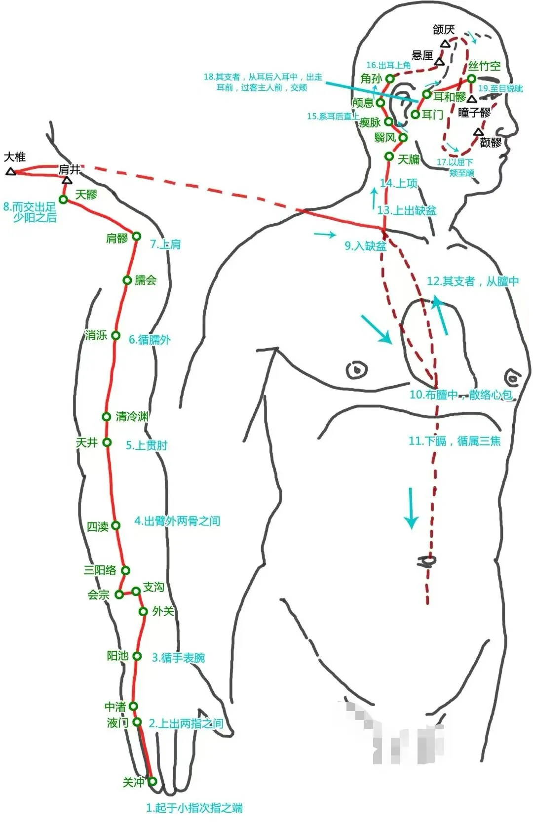 手少阳三焦经一侧有23个穴位,左右合计46个,以上歌诀读几遍就能朗朗上口,方便日常对照记忆: