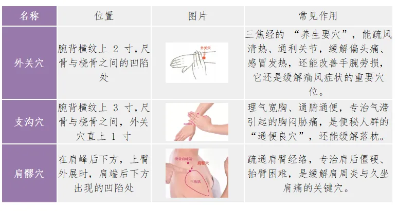 在三焦经二十多个穴位里,有几处尤其贴近日常、好用易记。它们不偏僻,就在手腕、臂肘、肩背这些我们常常僵硬、酸痛的地方。日常多留意、常按揉,就能帮身体疏通气机、缓解不适。这也是我们自学经络时,最容易落地、最能感受到效果的实用穴位。
